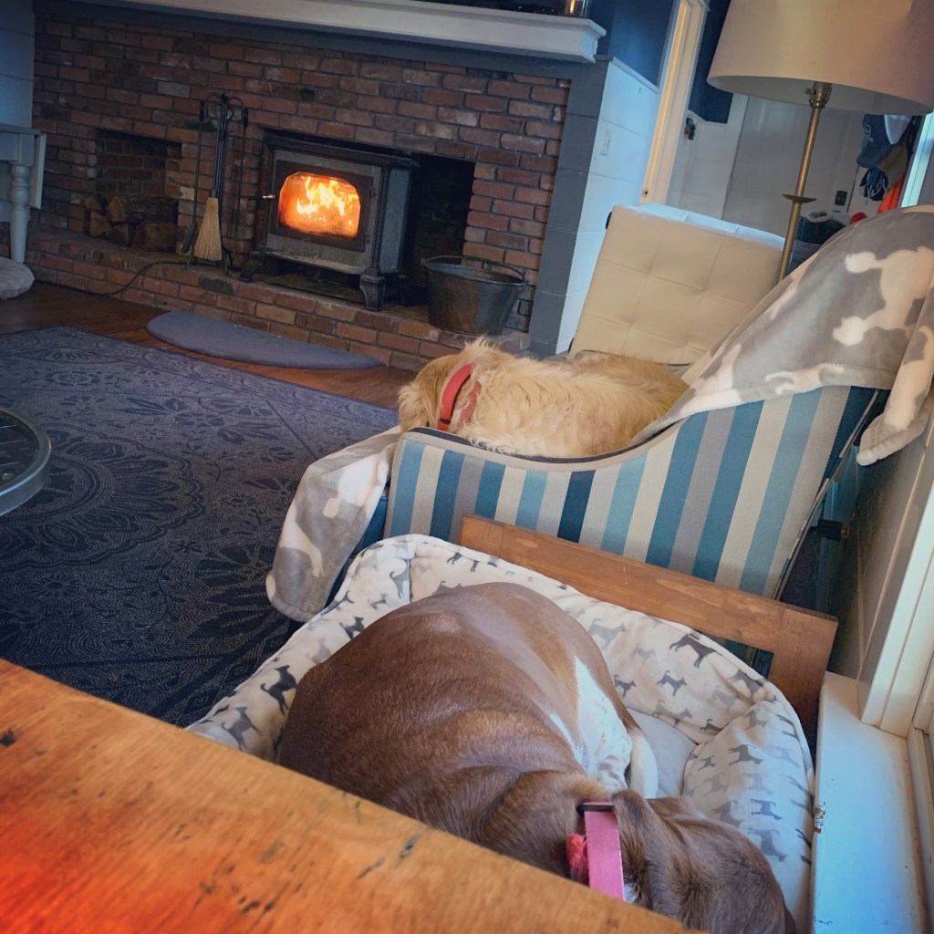 I started the fire back up this afternoon. The dogs were both inside, cozied up. I sat on the couch next to them. This is January in New England and I love it.
