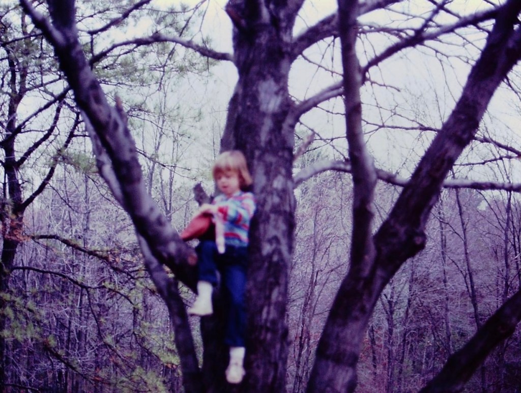 I found another old photo of myself. I’ve been trying to get in touch with this girl and it feels like we’ve finally connected. This photo helped. It’s a little blurry, but that’s about right. I like that I’ve carried some sort of bag up into the tree. I’m guessing the bag had some toys and probably some crayons or markers and a notepad. And I like that I’m not interested in moving about in the tree, I just wanted to get up into it. I just wanted to get up there and be in the tree. Because that’s a good place to be. And maybe when I’m up there in that good place, I’ll open my bag and see what I find.